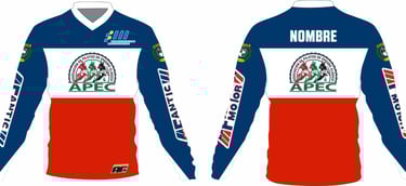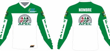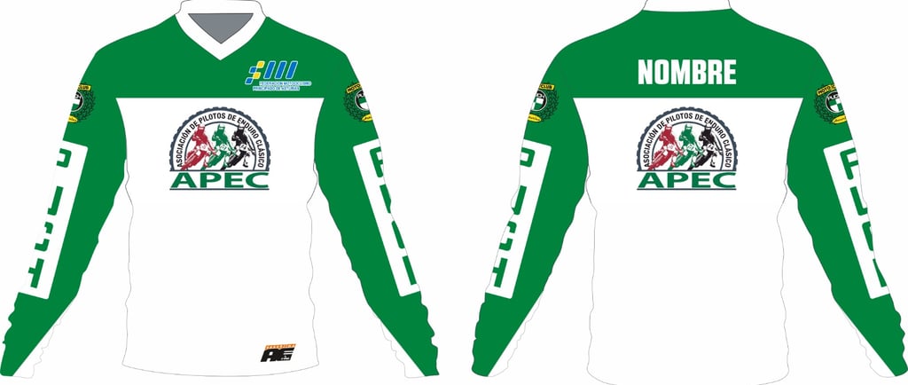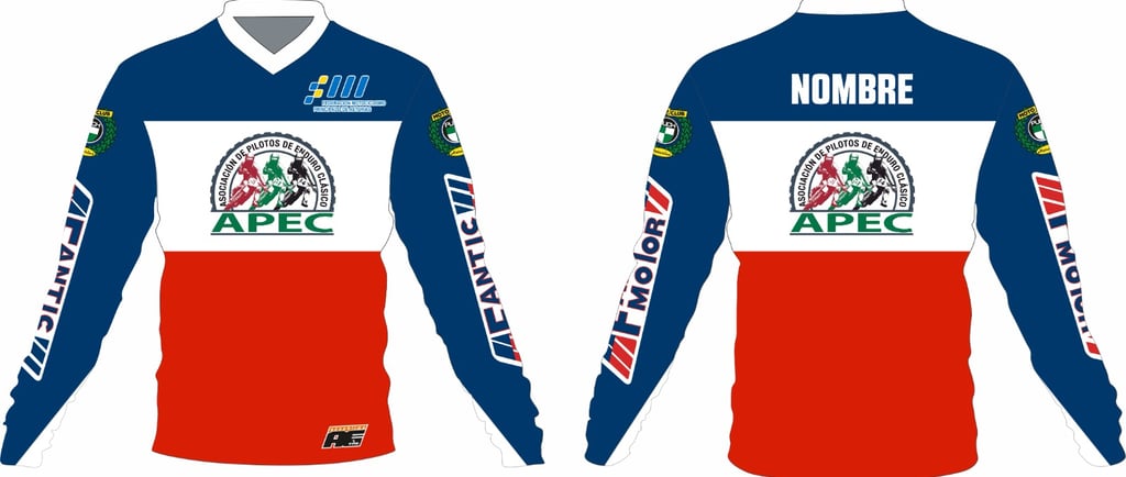 La personalización se puede hacer sobre dos modelos de diseño que adjuntamos a continuación donde se respetará el logo APEC en pecho y espalda sobre fondo blanco, pudiendo modificar los colores de las mangas y parte superior e inferior de la camiseta.
